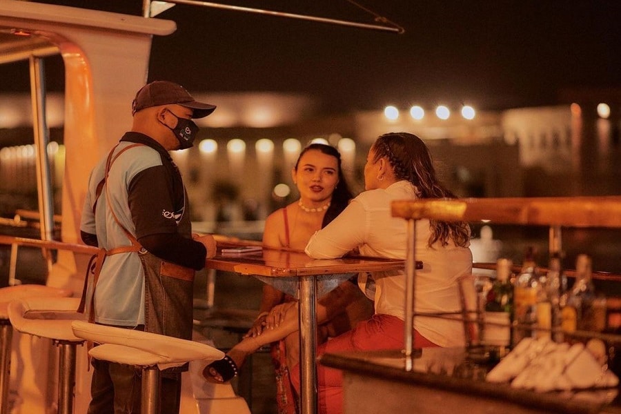 Upon boarding, the service staff welcomes guests with a smile and personalized attention. The tables are elegantly arranged, offering stunning views of the bay. As the ship sets sail, the light show begins: the skyscrapers of Bocagrande, the walled historic center, and the Caribbean skyline paint the perfect backdrop for this special evening.